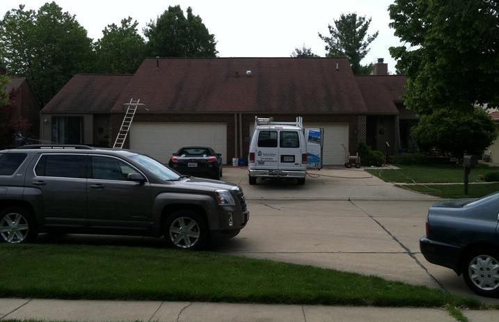 The homeowners of this duplex were tired of coming home and seeing those awful black streaks on their roof. The called us at Midwest Softwash and Pressure Wash and we were able to safely remove the black steaks and bring the original color back to the roof.